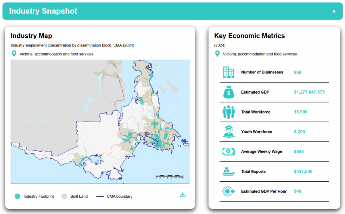 The Business Data Lab’s Canadian Industry Tracker is available to chambers that are part of the national network. The tracker combines economic, workforce, trade, productivity and business outlook indicators — many not previously available at the city level. The data shows how major Canadian industries are performing across 41 census metropolitan areas, including Greater Victoria.