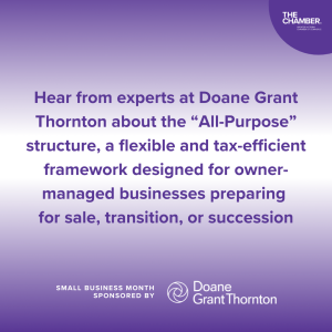 Small Business Month is an opportunity to highlight the unique challenges and opportunities faced by entrepreneurs. It is also a time to learn and grow with The Chamber. We have three great events to attend listed below featuring experts from both Doane Grant Thornton and Rogers Sports & Media. As well, please find linked below a selection of insightful articles and reports to help guide your business development from tariff impacts on Canadian Businesses, effective risk management, and succession planning to year-end tax planning, curated by Doane Grant Thornton.